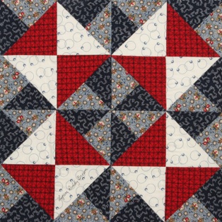 The block shown above uses 16 units that I have chosen to call Three-in-a-Square Triangle units. For 20 years I avoided making this unit because all of the instructions used measure- ments ending in 7/8". Since sewing two bias edges together was necessary, I did not feel I could make these units and meet my standards for precise piecing.