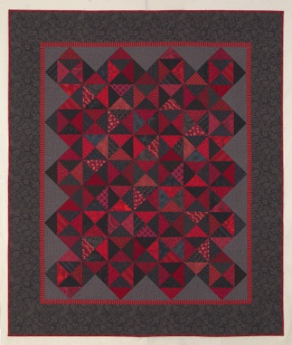 When I was choosing fabrics for this quilt I knew I wanted a variety of reds (orange reds, gray reds, burgundy). I also wanted visual texture (stripes, dots). On the dark side I thought I would use grays with the blacks. When the blocks were on he wall I found that many of the grays were too near the same value as the reds which caused the pattern to be lost. In the end I only used very dark grays with the black.