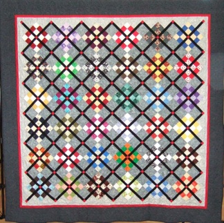 Cassandra Bolen traded four-patch blocks with her friends and made a larger version of my quilt "Lattice Make A Quilt". This square quilt is large enough for a queen size bed.