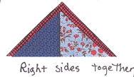 When I piece triangle units I like to make what I call "paired squares". Using oversize squares of the two fabrics that will be sewn together, lay the first fabric, right side up, on the ironing board. Spray evenly with spray starch. Lay the second fabric, right side down on top of the first, aligning the edges and press well until dry. The fabrics should now be smooth, crisp, lightly stuck together, and ready to cut.