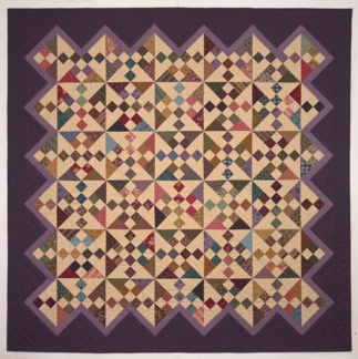 After the blocks for this quilt were made and put on the design wall in a straight set, they seemed boring. Putting the blocks on point helped but it was the addition of the purple borders that brought the quilt to life. Mary Ellen Hopkins says purple goes with everything. I have found this to be true.