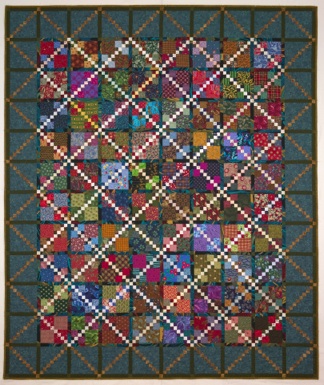 The light diagonal chain of small squares makes the Triple Four Patch block dramatic in many different settings. My Bee traded this block ten years ago. Three of the quilts from that trade appear in my book Simple Strategies for Block-Swap Quilts. The trade was so successful that we decided to do it a second time. I traded 80 blocks which were used in the center of this quilt. I added sashing and a pieced border made of additional triple four patch blocks but using the same fabrics. This quilt really does have 3,044 pieces!